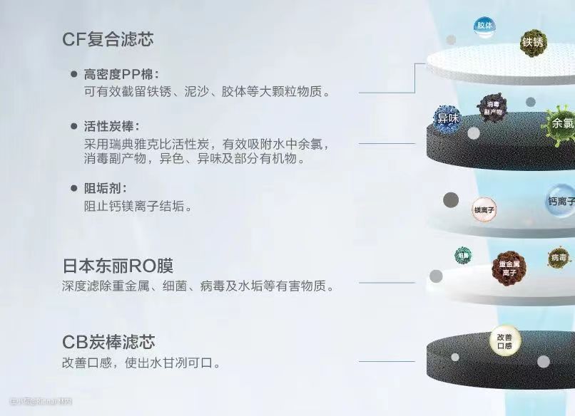 可以达到重金属(砷、镉、铅等)去除率>99.8%*,有机物(三氯甲烷、四氯化碳)去除率>99.9%*,游离余氯<0.1mg/L*,确保每一口水都甘冽纯净。