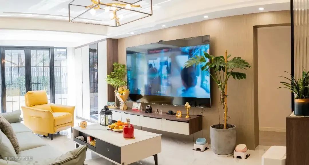 受不同户型的限制,在规划布局时,难免会碰到电视背景墙、沙发背景墙太短太窄的状况,这样会影响整体的视觉效果。而把同一侧、通往其他房间的门改成隐形门,则可以达到延伸墙面的效果。