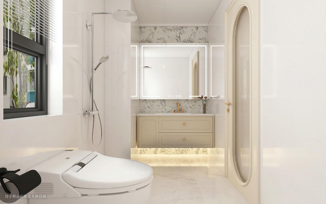 在卫浴用具的选择上,可以选择更圆润的款式,增加柔和感。选择奶油色微水泥或瓷砖通铺卫生间,局部墙面选择花片处理,明亮温暖的颜色,同时弱化轮廓,增加一体感。