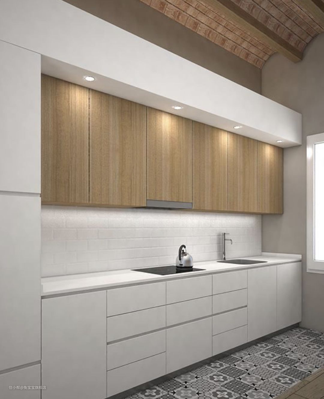 一字型设计比较适合长条形厨房,结构简单明了,节省空间。使用者可以按照自己的习惯,将收纳区、烹饪区、清洗区由左至右或由右至左排列。