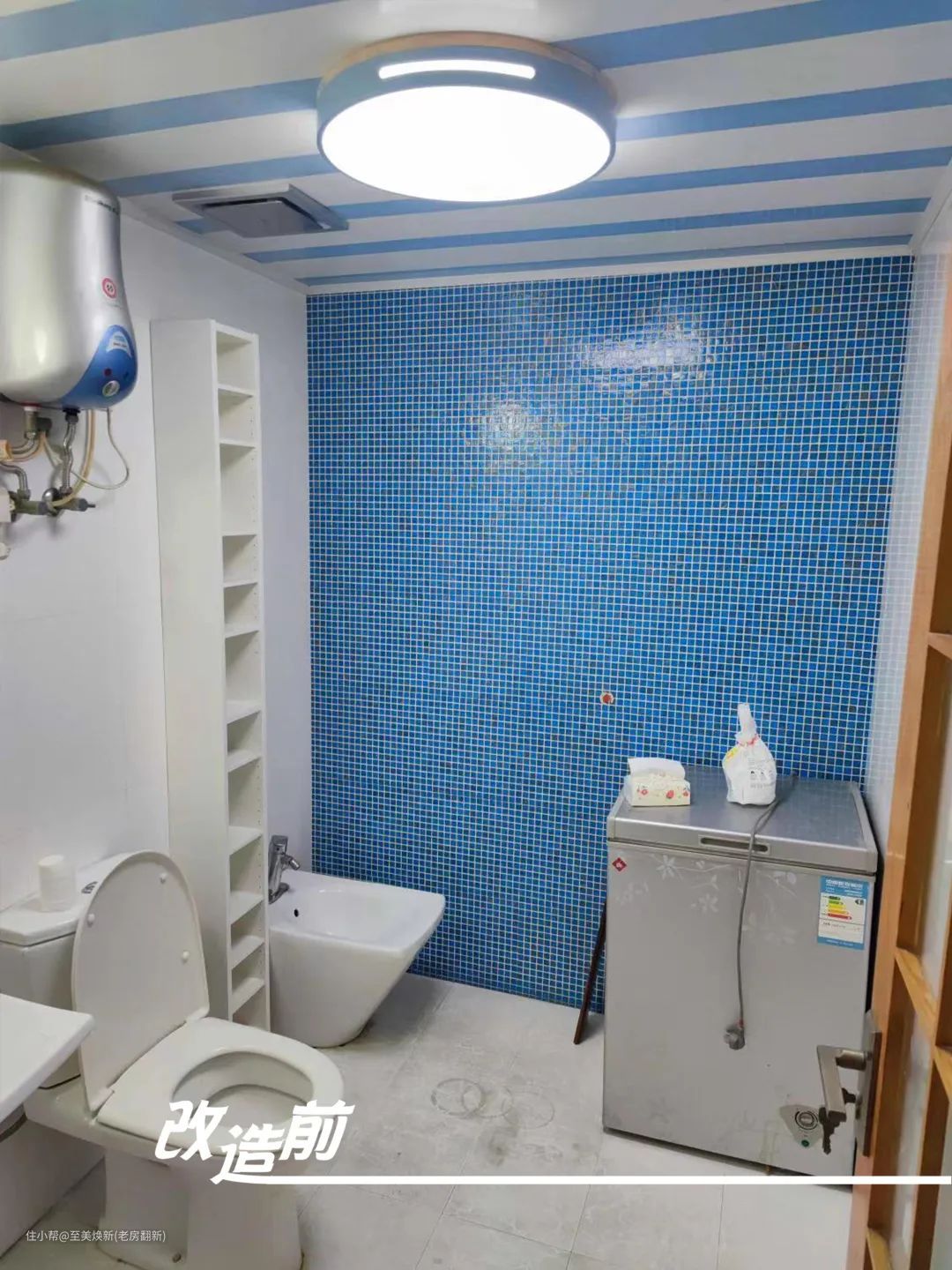 卫生间收纳区太少,每次沐浴,衣服都没地放,只能放在洗衣机上,而且内侧墙面选用了小片的蓝色瓷砖缝隙多容易滋生细菌,每次清理起来费时费力。