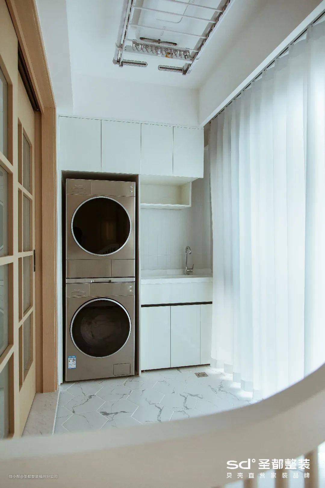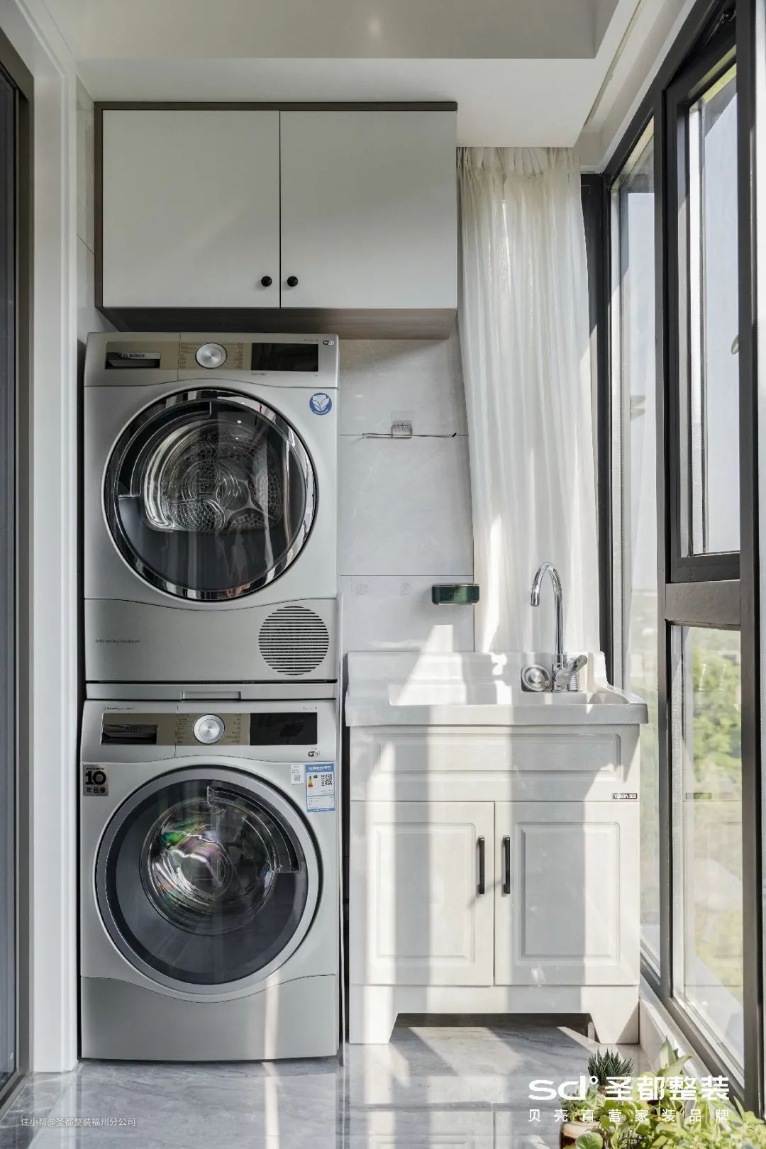 阳台装上洗衣机和烘干机,衣服即洗即烘,少了晾晒这一环节,大大节省时间和精力: