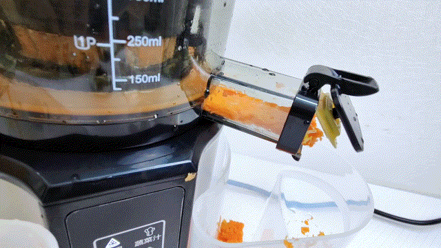 7段螺旋切片和静音低速大扭力的配合作用,对于硬质和高纤维果蔬的榨取确实出色,全程没出现卡机断电的情况,非常流畅。另外如果说材料一时之间放的太多导致搅切不均匀的话,机器还支持一键长按反转,充分利用这个特性,可以把所有材料搅切的更加完美,榨取更多的果蔬原汁。
