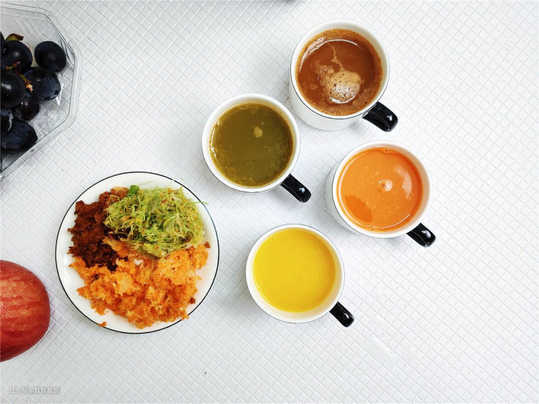 而最棒的是原汁里面没有一点果蔬的渣,看看下面这几杯,胡萝卜、西芹(带少许胡萝卜)、苹果、和橙汁,原汁晶莹剔透、一看就细腻可口。