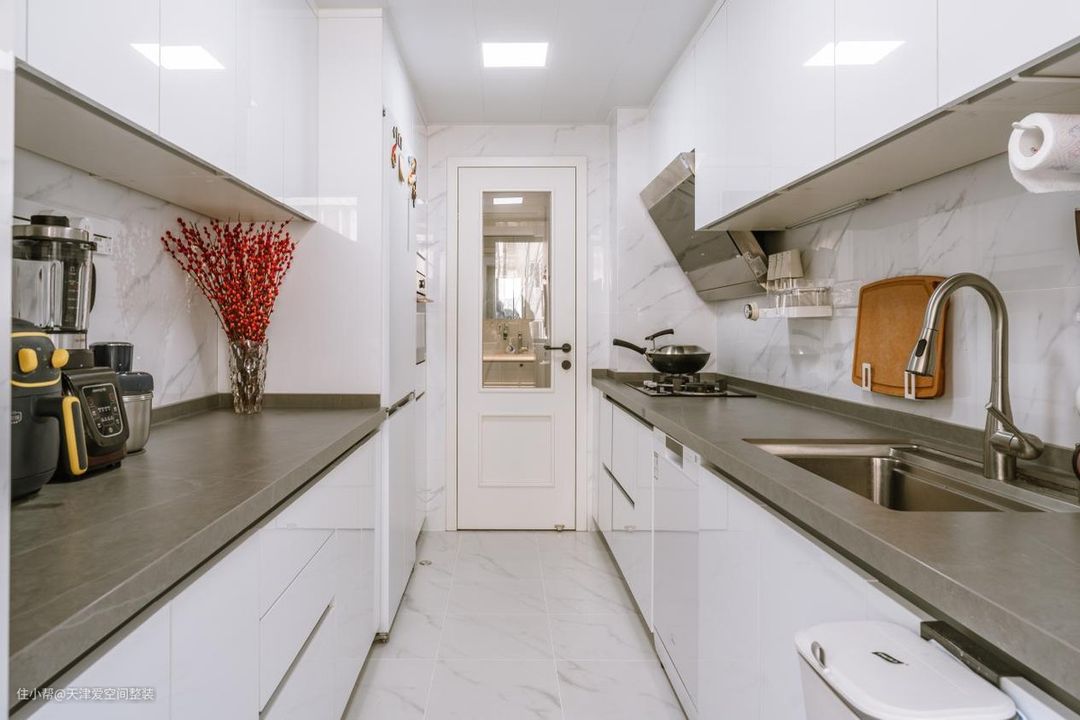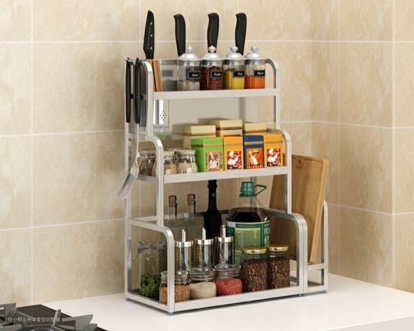 因为厨房大部分被橱柜占据,没什么地儿放大架子,但例如冰箱与柜体的间隙,就可以选可移动式小置物架。当然还可以买个便捷的移动式小推车,把常用的放各层,可随意移动。