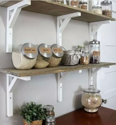 墙面收纳也可以用隔板,常用的瓶瓶罐罐都能放。还可以白盆花作为点缀,绝对让厨房充满生气。
