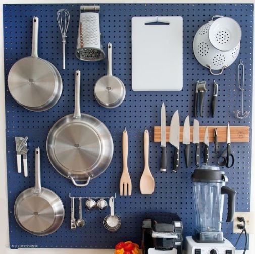 洞洞板也是个不错的选择,所有零碎用具取用得心应手。当然,你也可以在设计橱柜的时候做一些置物架,不过价格较高,没挂杆实用,不建议做太多。