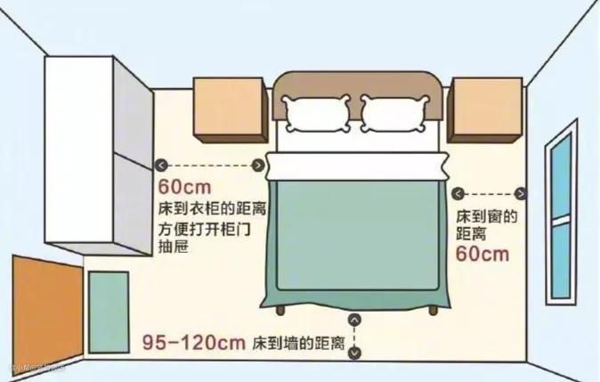 卧室床尾到墙体要留出60~80公分,床边到衣柜要留出60到~80公分。床千万不能只看床垫尺寸,床都是有造型的,一定要看床架尺寸,同样是放1.8米的床垫,有的床宽度是2.06米,那有的床宽度能达到2.36米。
