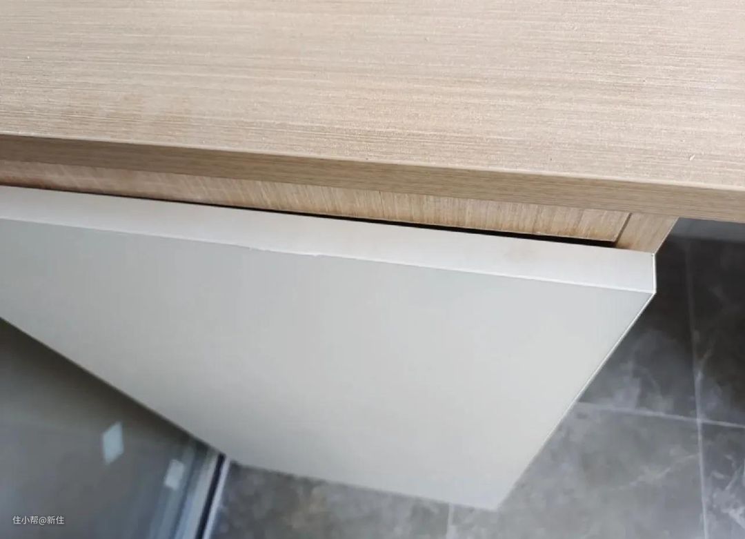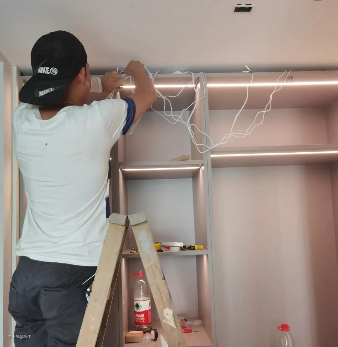 其二,为了给灯带提供电源,会有如蜘蛛网般的灯线。那这些灯线不可能留在明处影响美观,就只能塞进柜子的背部、或者顶部然后用封板遮挡。