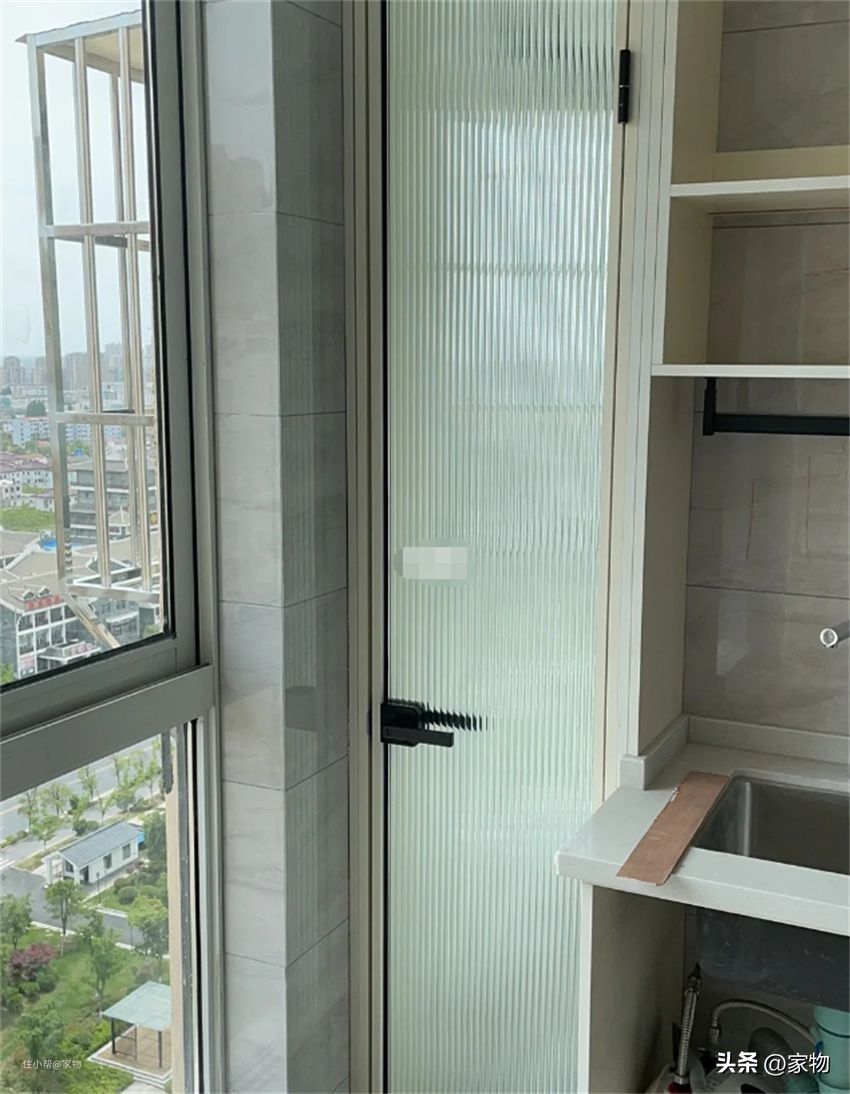 屋主同样采取砸墙的形式做出一储物间,外侧装一扇玻璃门,关门后不影响阳台全貌,储物间内再乱也没人看到~
