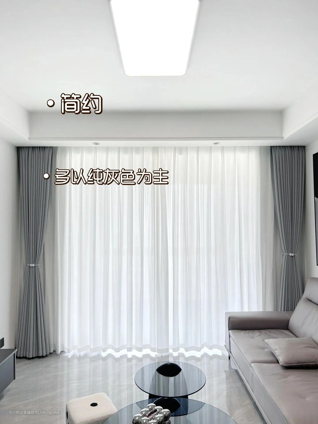 简约风:室内多以黑白为主,所以窗帘颜色上建议选择纯灰色协调视觉,材质上建议有光泽感的高精密,更大气
