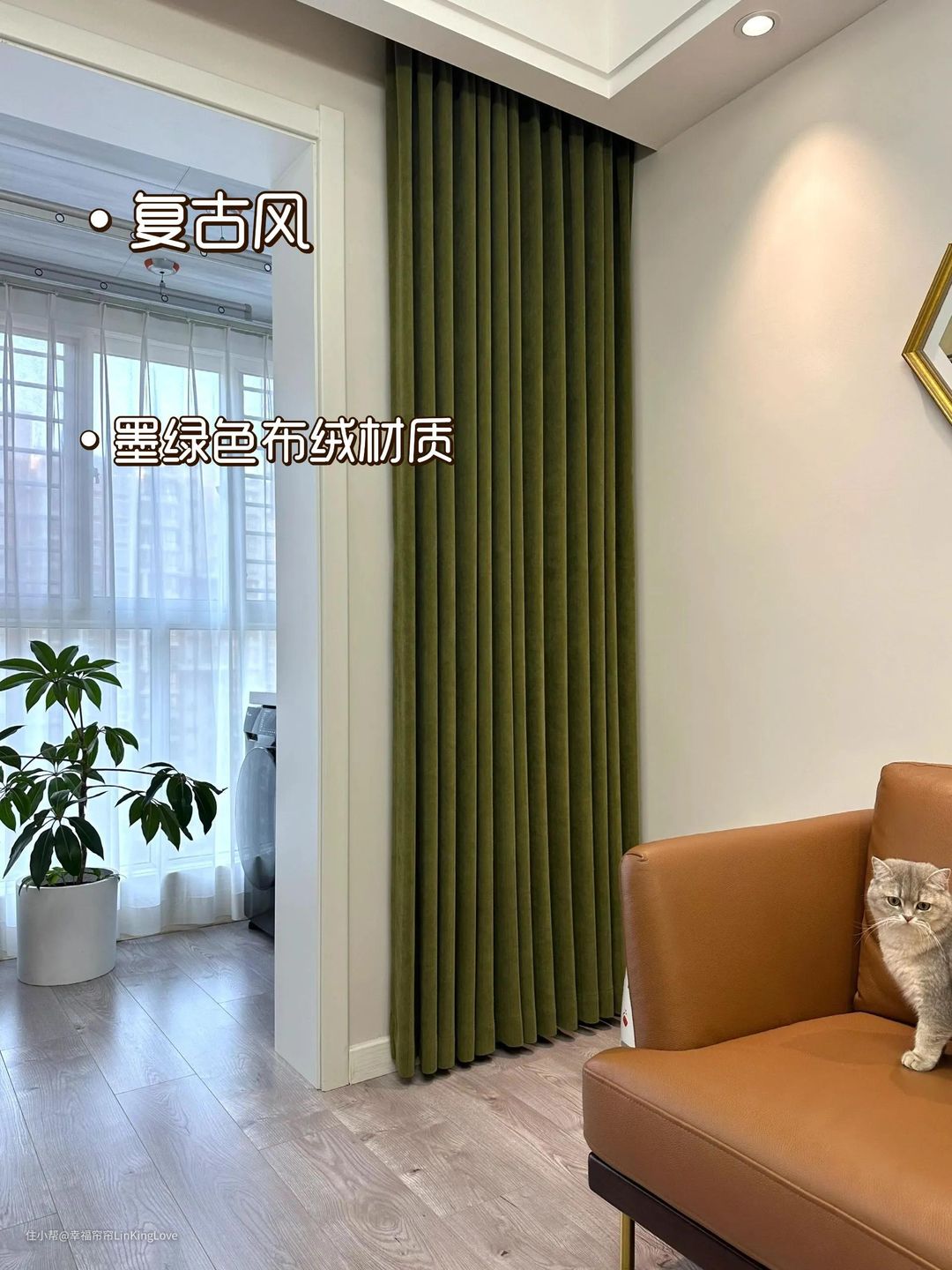 法式风、复古风:窗帘建议选择绒布类,丝滑大气上档次,色彩选择上,复古法式可选择浓郁的墨绿色咖色、咖色等,可以给整个装修风格增添华贵,丝滑大气,轻法式可选择奶油色等淡雅的颜色