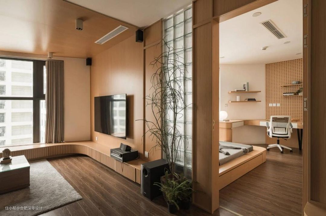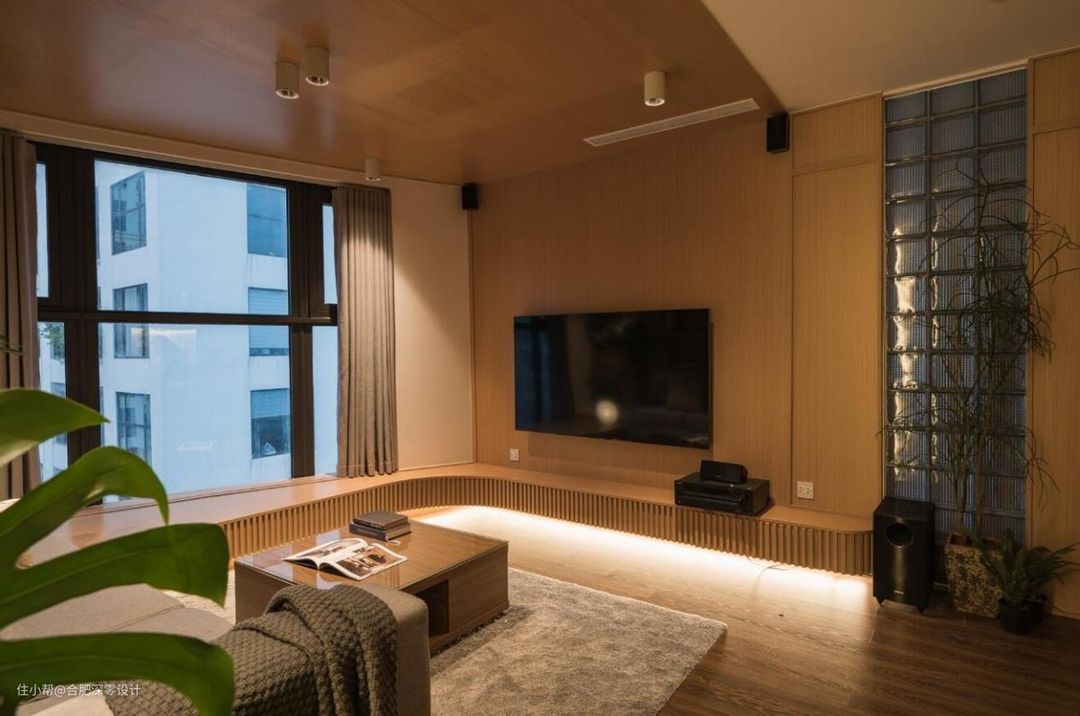 悬空柜底部增加灯带辅助照明,搭配大面积木质上墙更加舒适惬意,壁挂式电视机上墙,提前跟师傅沟通好预埋管道,也省得乱七八糟的线外露,局部非承重墙面用玻璃砖,视觉上更显轻便。
