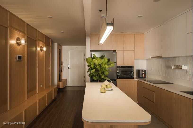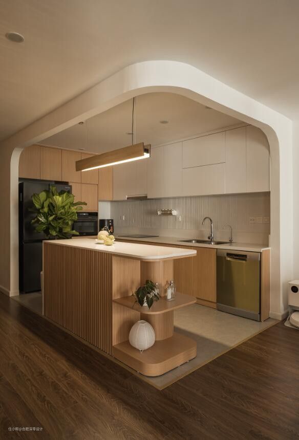 厨房中新增岛台优化动线,边角改成弧形跟顶部相呼应,室内没有一味用吊柜+地柜增容,侧边设高柜,收纳更加充足,还能妥善安置内嵌的冰箱。