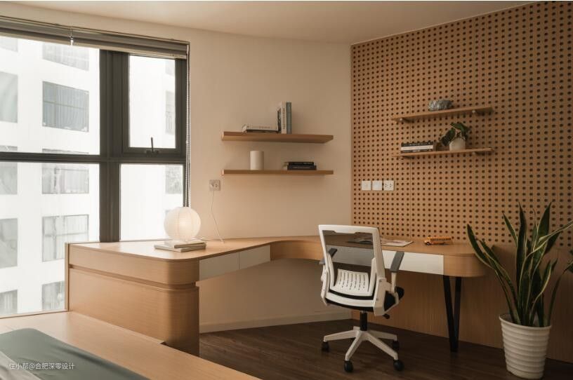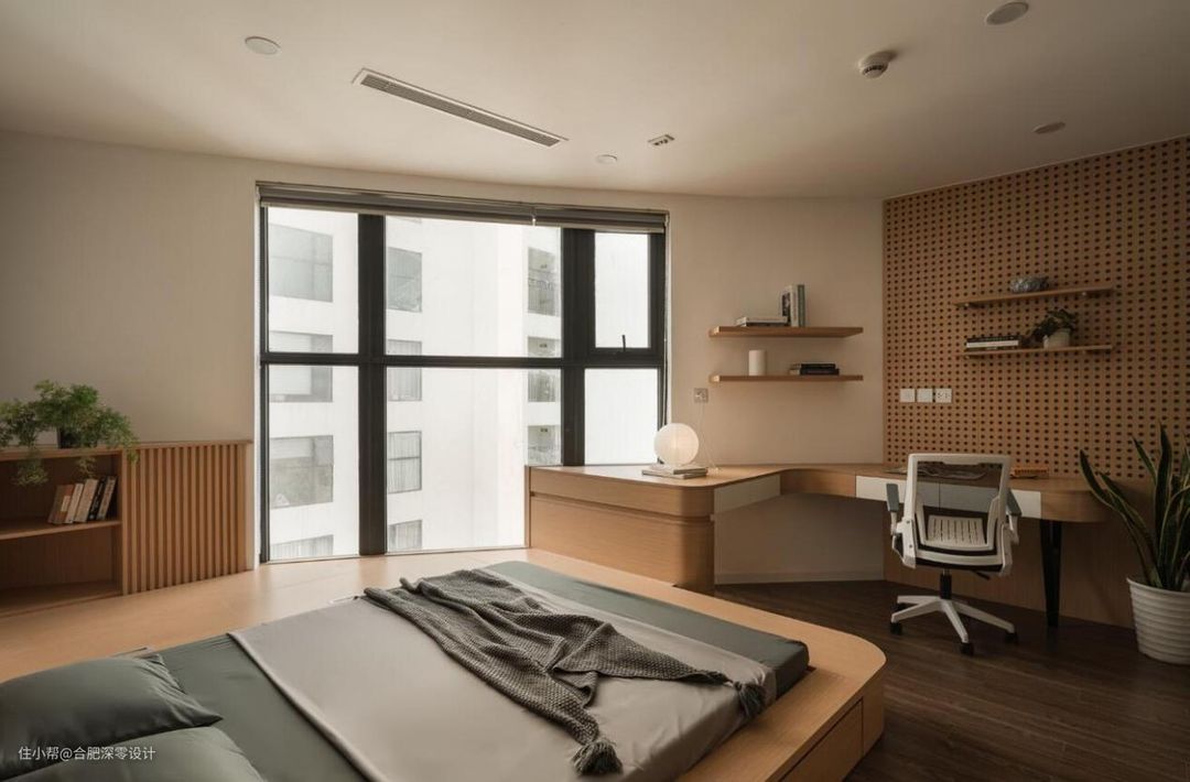 床尾就是书桌,可同时兼顾2人学习,考虑到床临近窗户,窗户隔音隔热都选了顶好的断桥铝,局部边角还适当增设柜子。