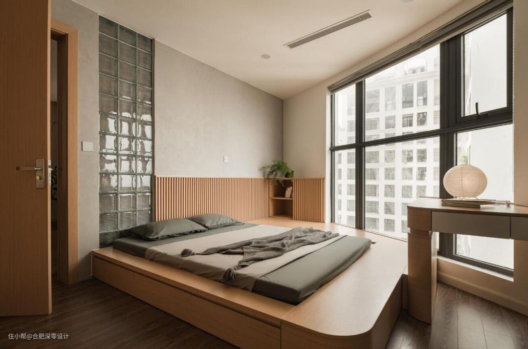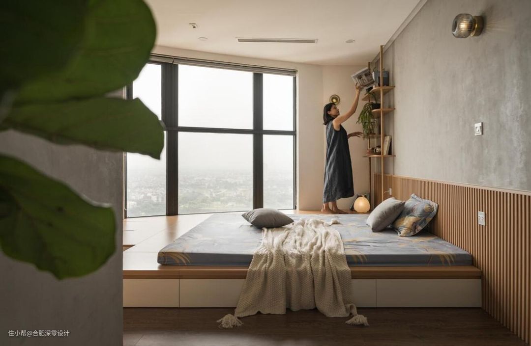 电视墙一侧藏着一道隐形门,就在玻璃砖旁边,推开后就是一间卧室,面积倒也不算小,但却是不规则的,请师傅现场打榻榻米床,铺上床垫就好了,必要时还能增容。