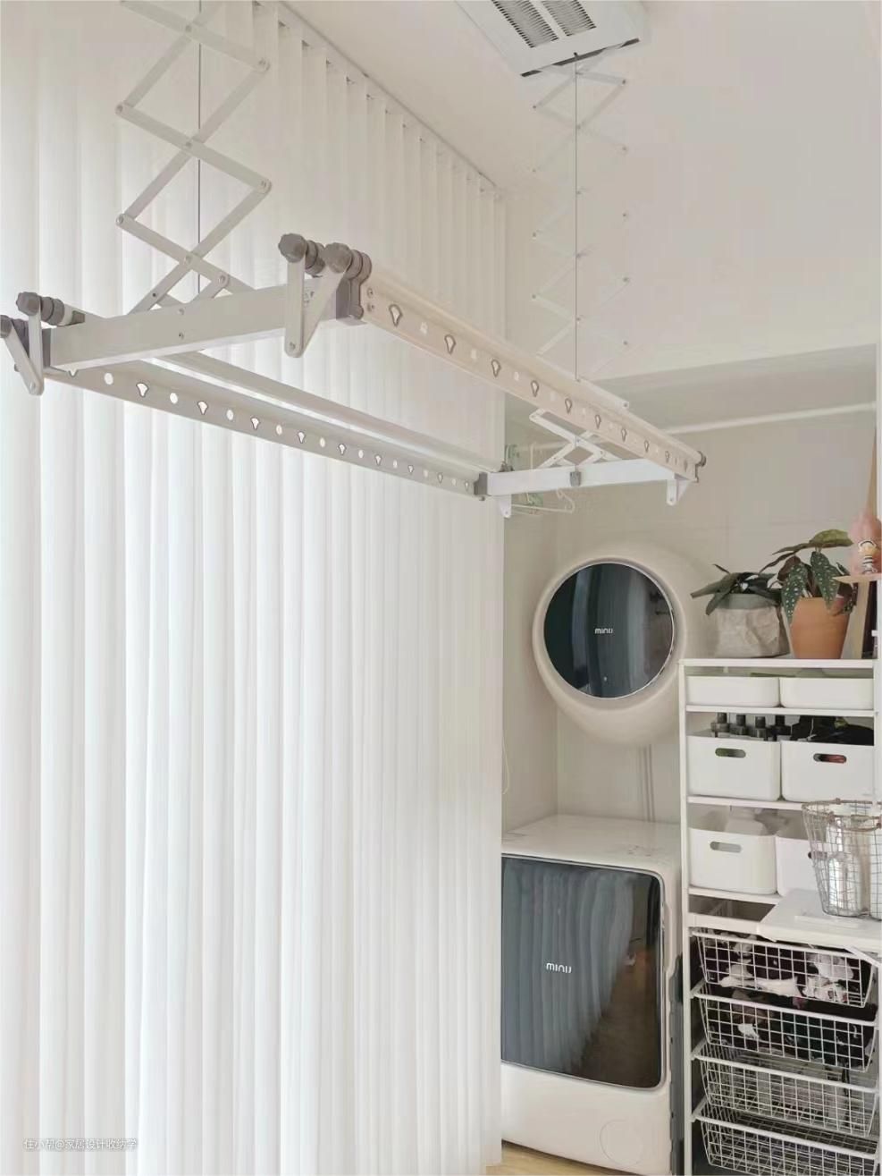 3.独立式的烘干机+电动升降晾衣机,如果家里有干衣机(烘干机),就能轻松解决干燥问题,尤其是在雨期时间较长的南方,湿冷的冬天,烘干机简直可以续命!若没有,原则上能送风、能除湿的家电,都是室内晾衣的好帮手!