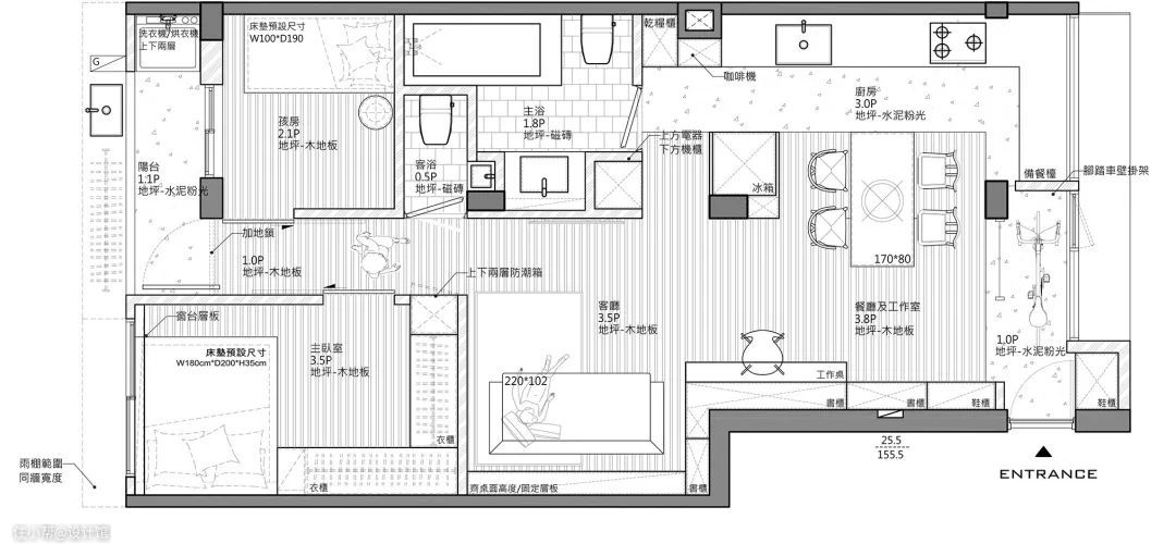 ▲进入这个房子的玄关,首先你看到的是一辆自行车悬挂墙壁上方,地面与墙面都是低调的灰色,左侧加入一道屏风,右侧则是百叶帘的设计,整个进门空间显得简约明亮而温馨自然。