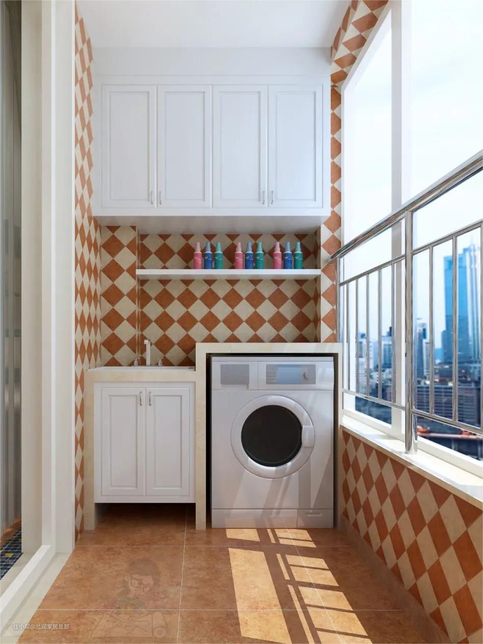 阳台的洗衣机、洗手台、水龙头等安装墙面,经常用水、易潮湿,建议贴瓷砖,打理更方便,同时墙面不易出现渗水漏水的情况。