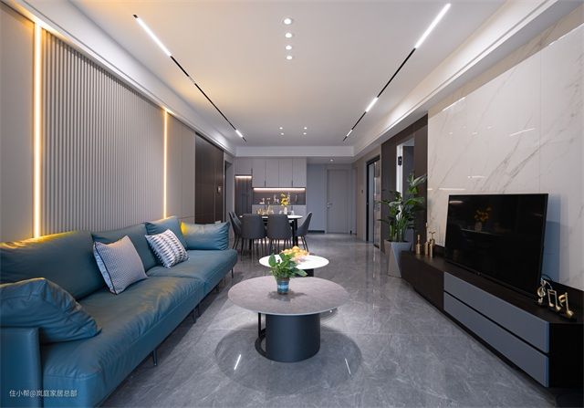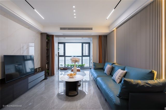 软装的色彩搭配更鲜亮,蔚蓝色的皮质沙发,柔软舒适,还自带一种高级精致感。色彩的多样化,也提升了整个空间的明亮度。