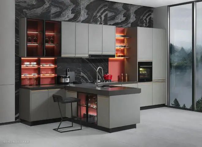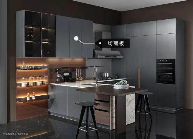 像下图欧派《光影》橱柜就使用了绮丽板,门板采用了金属拉丝质感的PET材料,绿色环保,拥有独特的光感与线条感,还有出色的耐污、耐高温性能,非常实用。