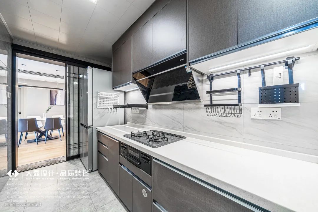 厨房空间比较狭长,以干净的冷色调为主。洁白的石英台面,便于清洁油污,更好地保持厨房的干净整洁。