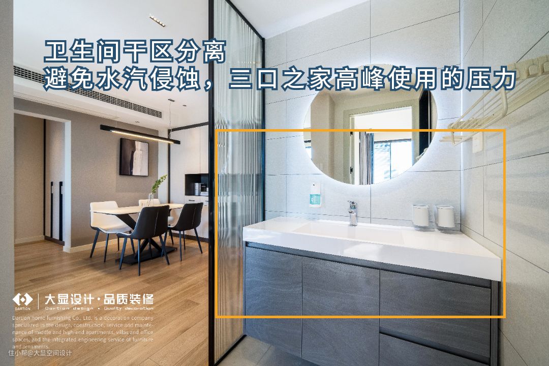 卫生间做干区好处很多,既可以避免台盆镜面的雾气,又可以避免木柜受潮变形开裂,并且还方便以后的三口之家洗漱高峰期分区使用。
