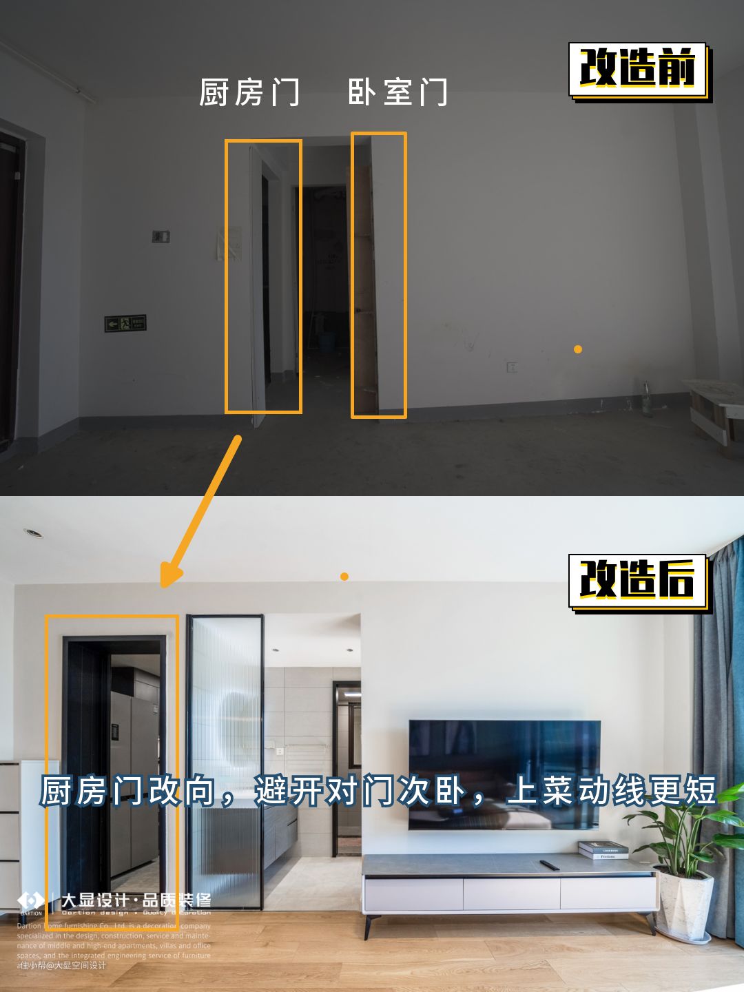 原户型厨房出口对次卧的房门,难免会有炒菜油烟味传到房间里,拿菜去餐桌也会比较绕。所以我们就将厨房门改向,对应餐桌,上菜动线流畅。