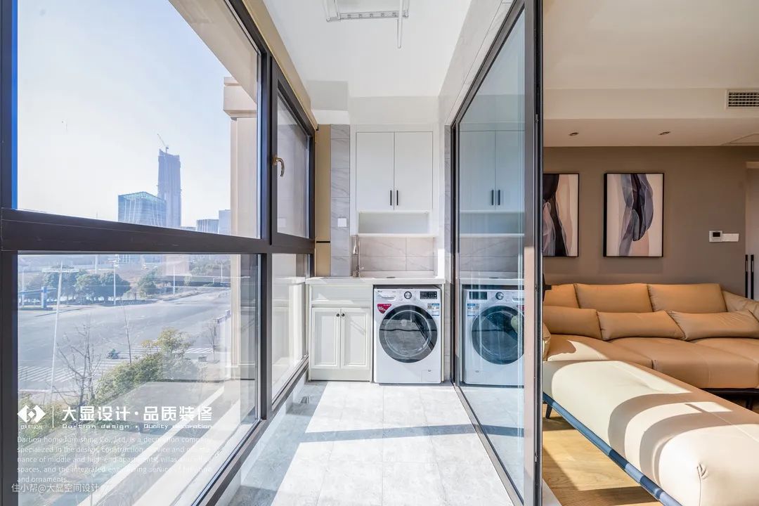 阳台进行了封闭处理,平常洗好的衣物也可以在这里晾晒,沐浴在阳光之下。洗衣机上方吊顶橱柜增加了储存量,充分利用了空间,可放置洗衣液等物品,方便取用。阳光照射下来,这是真实而美好的生活。