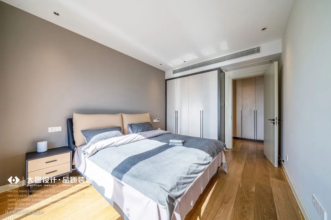 次卧空间略微狭小,但衣柜采用了左右推拉门的设计,有效节省了空间。