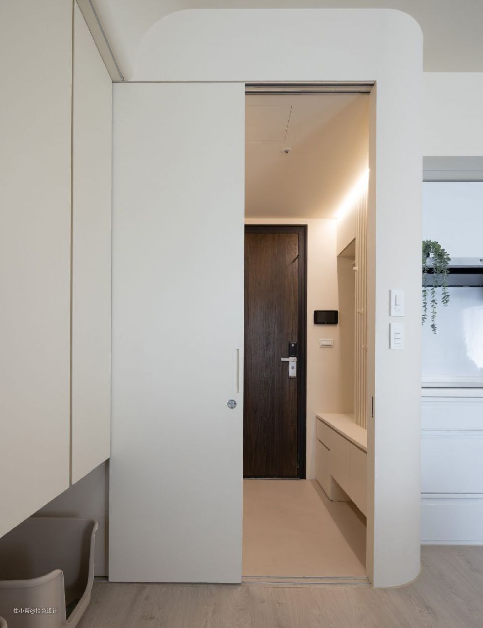 比如本案这位屋主,就给家里设计了一个封闭式玄关。相较于传统的玄关隔断,不仅起到了隔尘的作用,也让室内更加私密了。