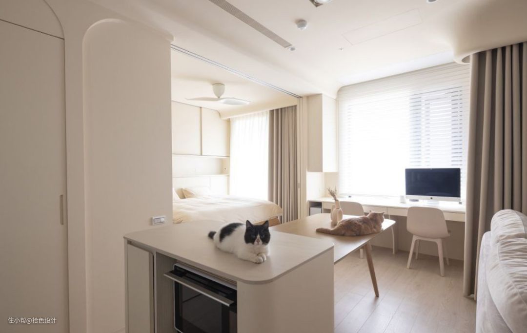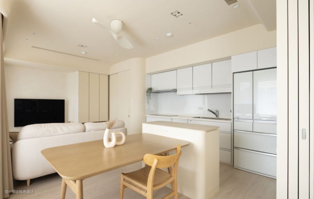 当原有的次卧拆掉之后,几乎所有的空间都做到了互通,并在奶油调的衬托下,让人有了一种极度放松、慵懒的疗愈感。