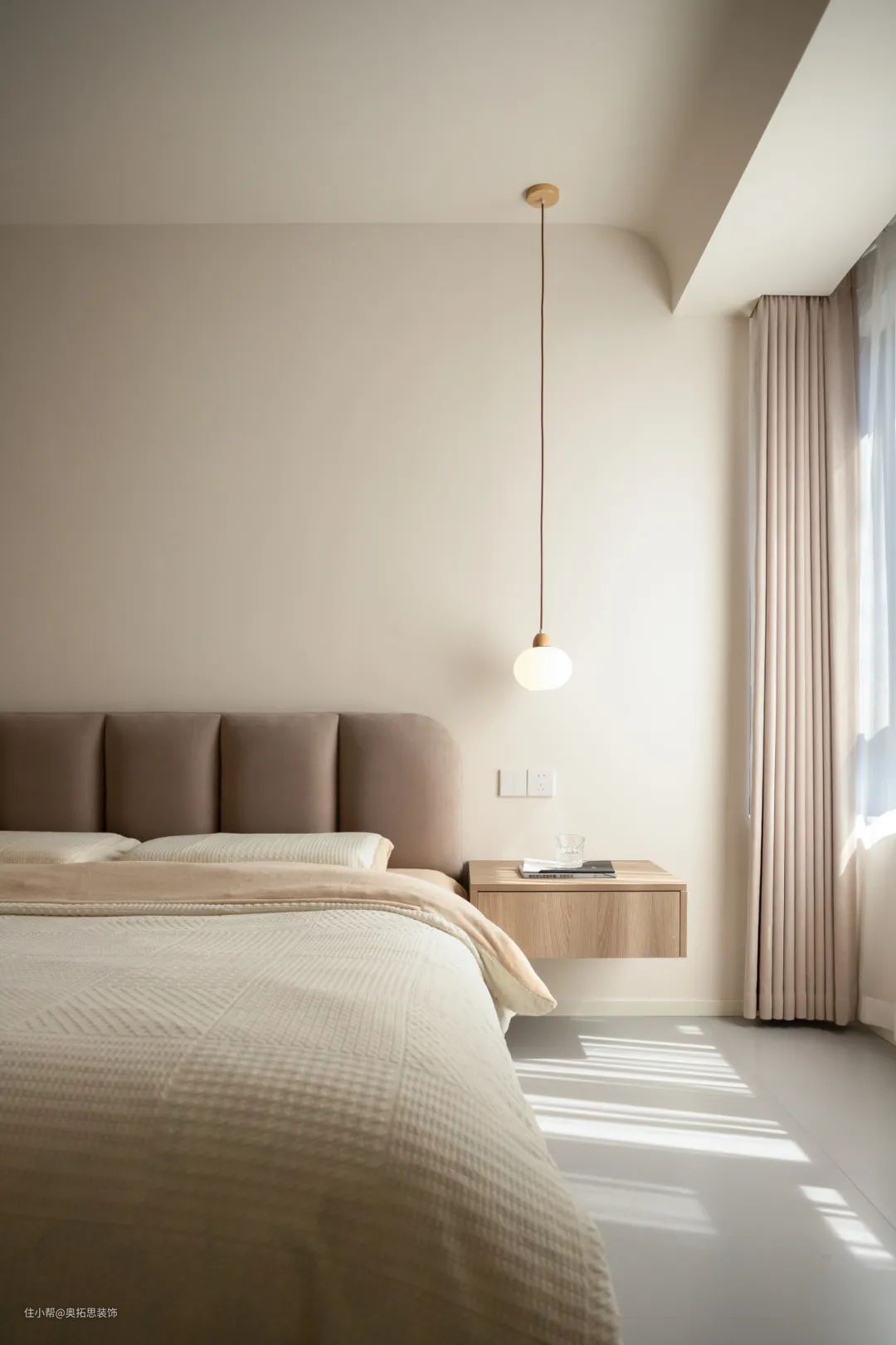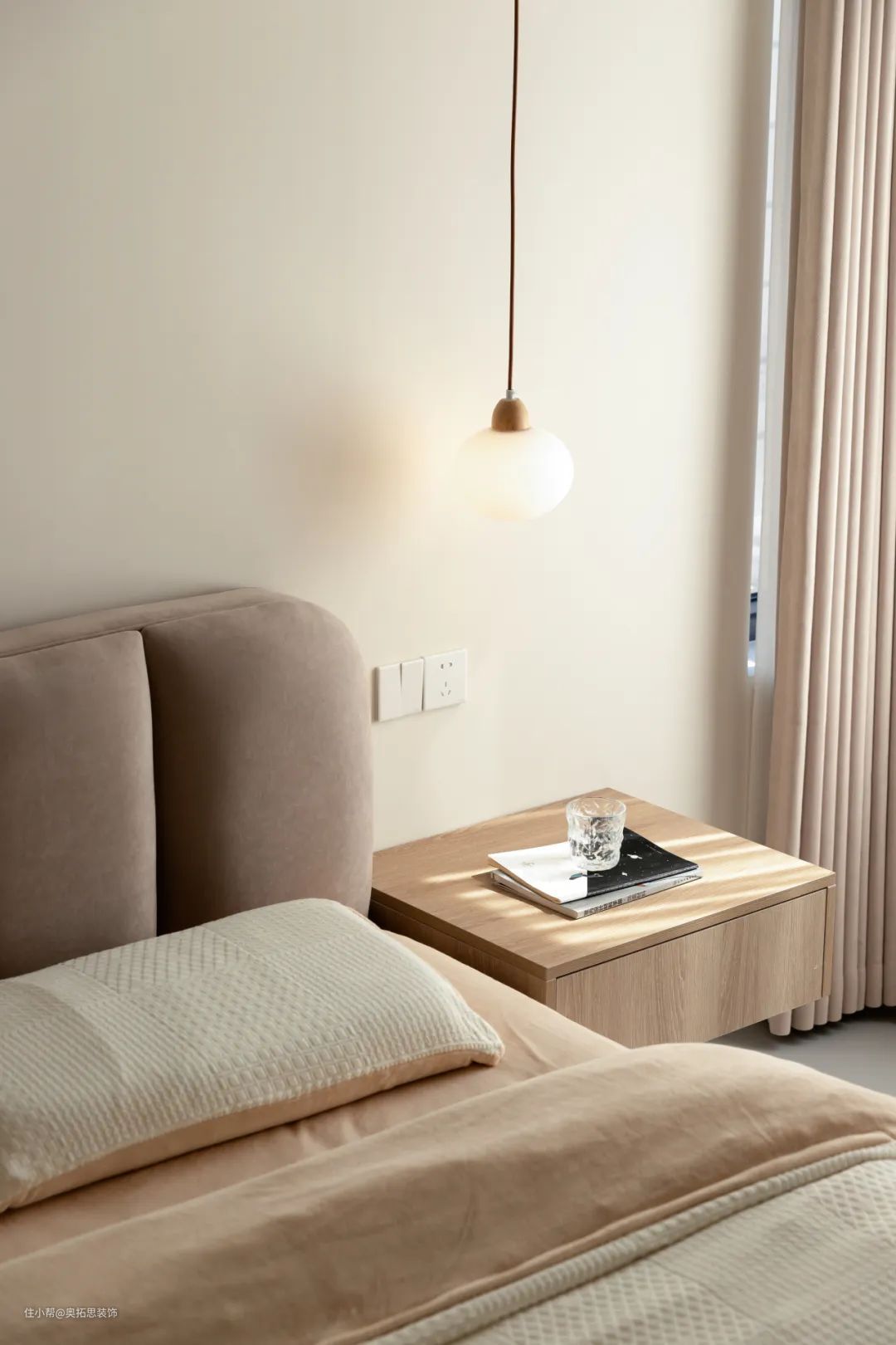 卧室床头柜都是定制悬空的,左边和梳妆台相连,做了层次。