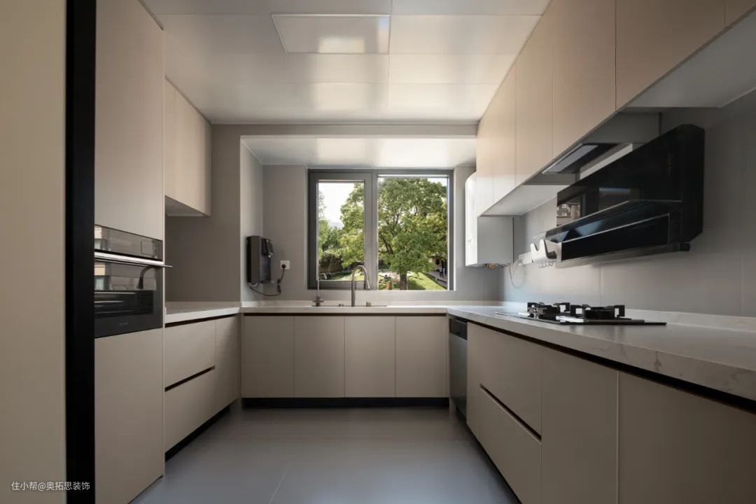 厨房是U型布局,最大的好处就是收纳最大化,其次就是动线合理,嵌入式蒸烤箱、直饮机等电器一应俱全。