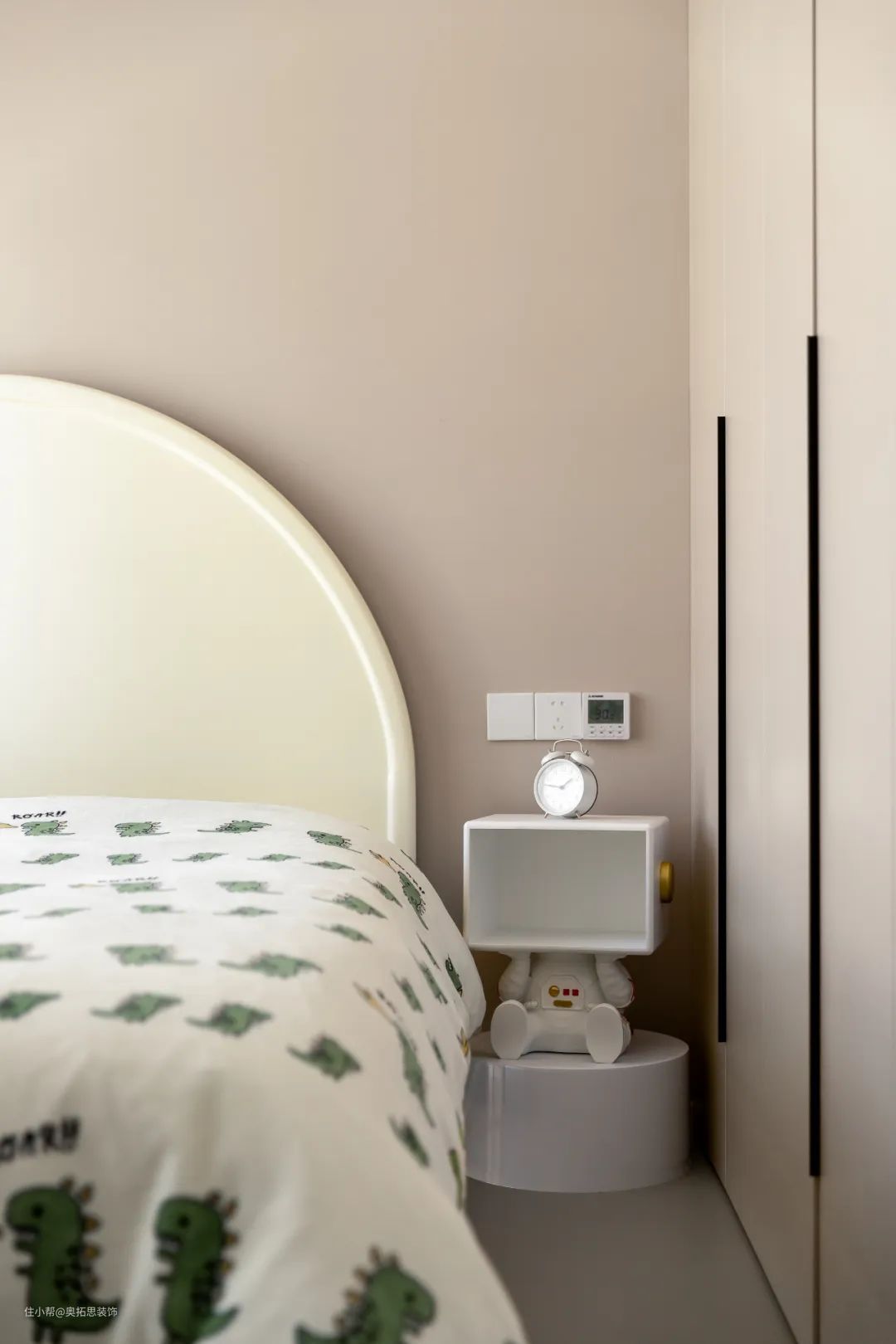 儿童房考虑到孩子的成长,还是先往童趣方向设计,不用考量一张床睡到大学毕业。暖色系依旧沿用整体色系,床头柜、闹钟,以后回忆起来都是童年。
