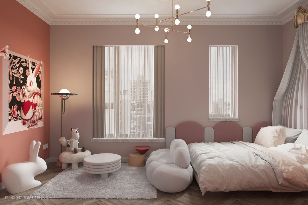 3、女儿房,女儿房可以多注重软装,打造更加舒适温馨的空间,元素上可以多用一些花草、动物等元素,衣柜的空间可以多些。