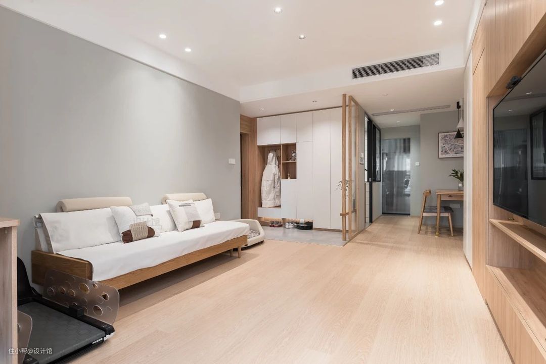 在采光不好的空间,千万别用太大太堵的设计,比如玄关与客厅之间的隔断鞋柜,如果做成通顶鞋柜就会让空间更加昏暗,要适当加入镂空设计,比如镂空的屏风+矮柜鞋柜代替通顶鞋柜,会让空间明亮通透很多。