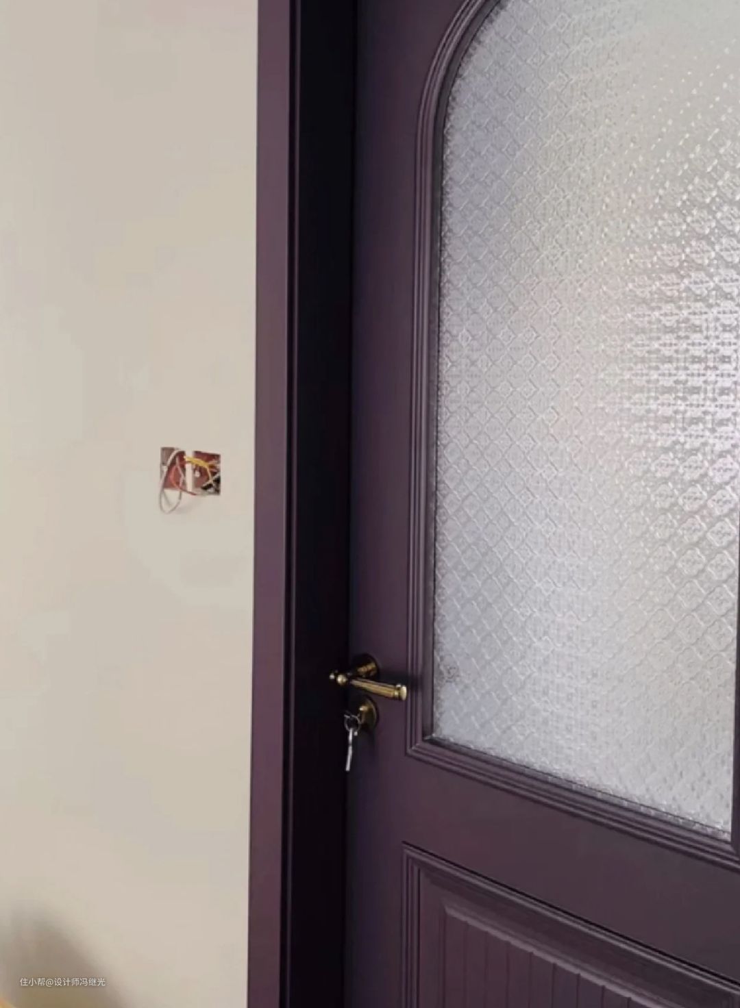 深紫色门:深紫色门与杏子灰的墙面搭配,形成高对比度的效果,给人一种典雅、奢华的感觉,这个搭配更适合最近也还比较流行的复古风格或是轻奢风格