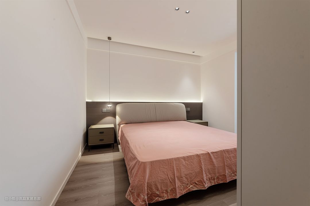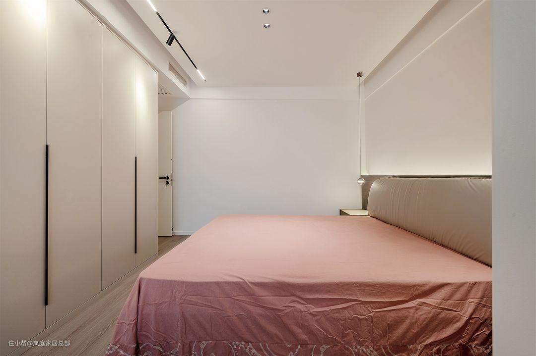 同样延续了客餐厅的悬浮式无主灯吊顶设计,安装滑轨射灯和筒灯做主要照明,对不是特别大的空间来说更合适,不会显得局促。床头一侧额外安装一盏小型吊灯,晚间照明更方便。