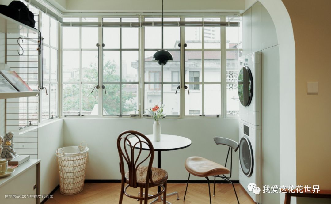 洗烘衣物也在阳台完成,“洗烘套装”被做成内嵌式的,嵌到柜子里,只露出个机器的脑袋,整体的线条也更流畅。