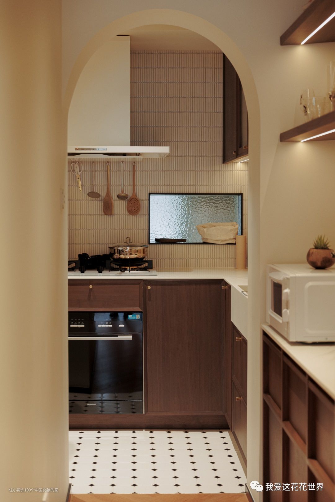 L型的厨房用了“白+胡桃木”的配色,和抹茶绿形成了视觉上的和谐,不算实用,但美就够了!