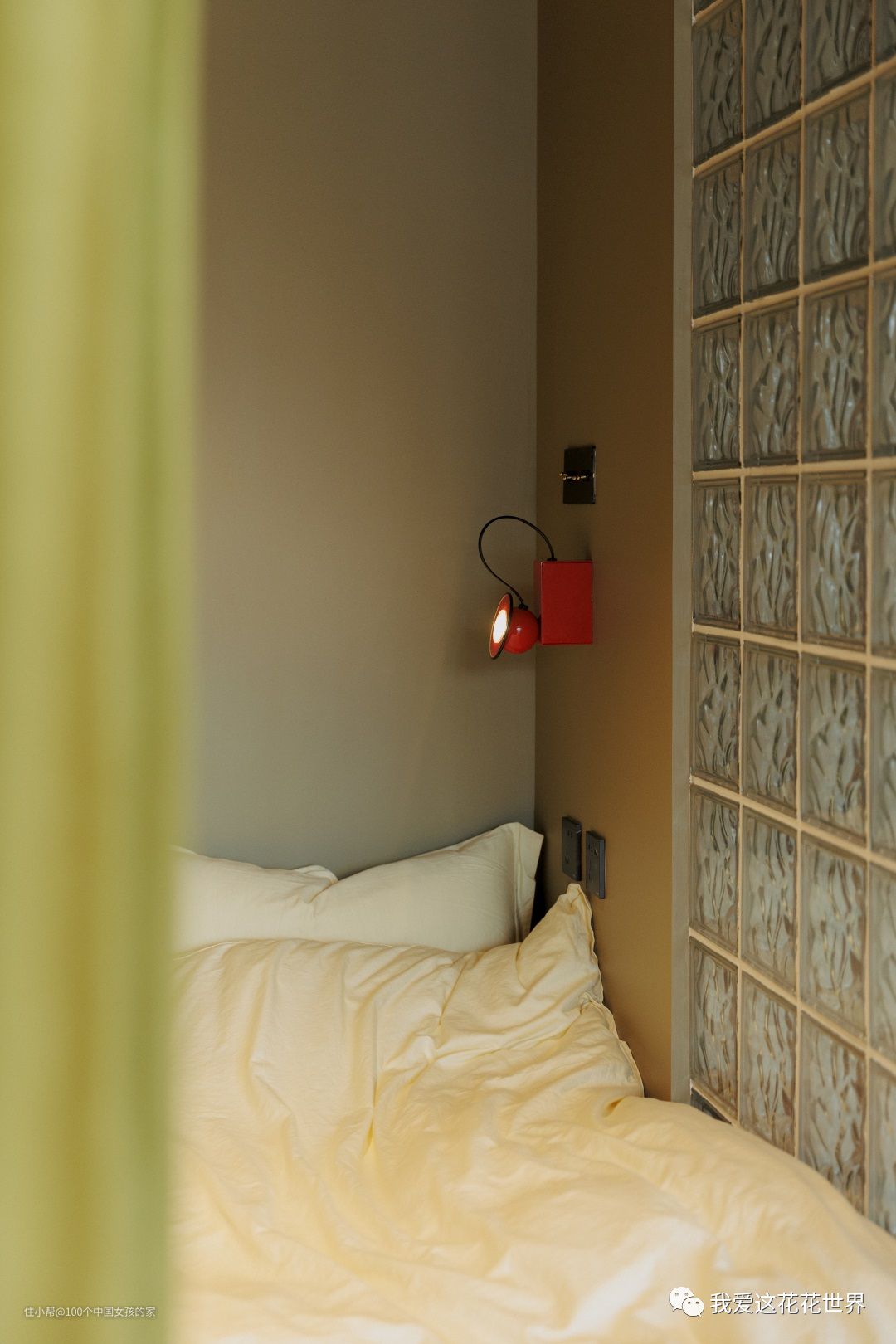 椰子是个狂热的绿色爱好者,抹茶绿的弧形墙面、玻璃砖、绿丝绒帘子,构成了盒子卧室的主要元素。