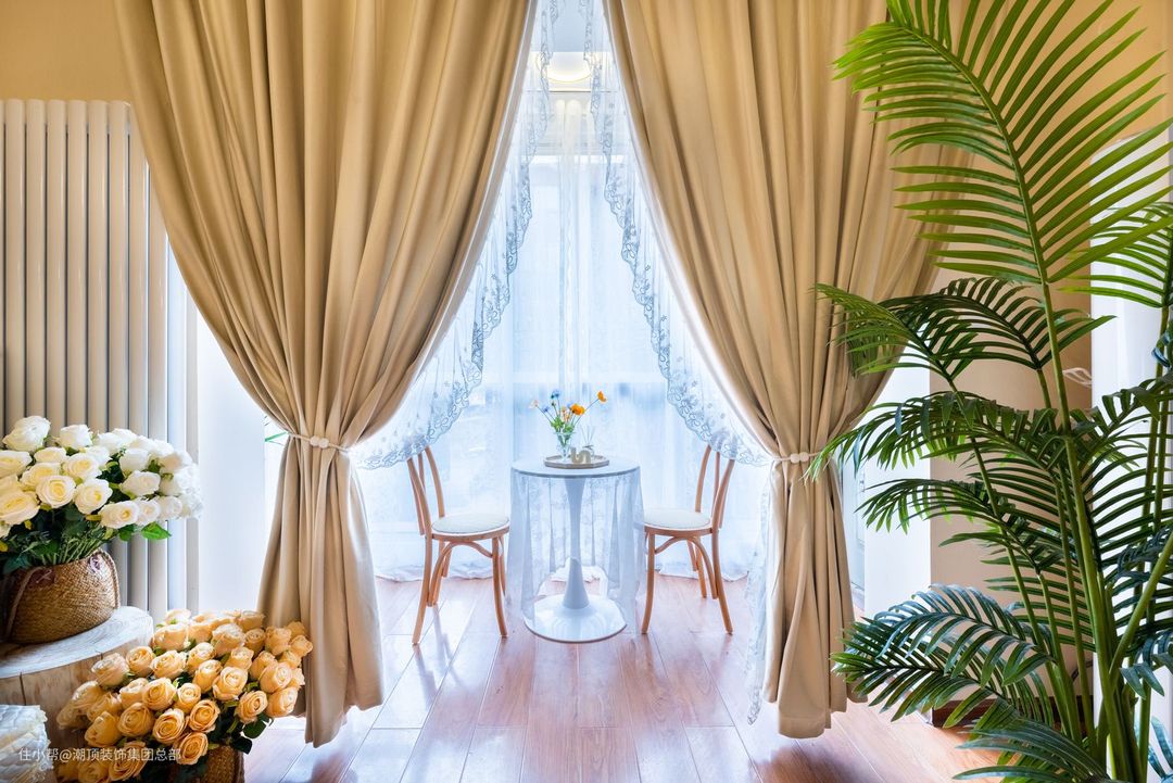 精致下午茶,精致的设计,全屋定制窗帘,摆上休闲茶几与小椅子,旁边摆一盆绿植装饰,在自然舒适的光线下,带来一个明亮轻奢的家庭氛围感体验。 #阳台#窗帘#茶几