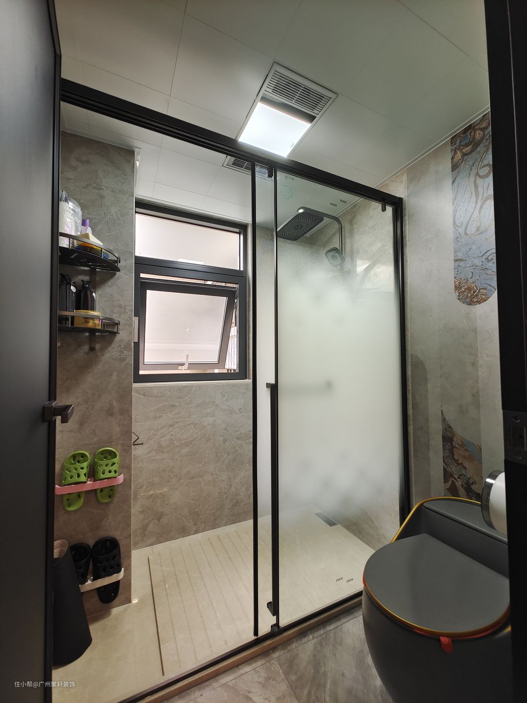 再往里看,图三上的日常用品都有,花洒、拖鞋、浴霸、洗发水洗发露等用品。说到浴霸,相信有不少业主在考虑是使用风暖浴霸还是灯暖浴霸,其实无论是风暖还是灯暖,其主要的目的就是提高室内的温度。如果想要安全点的,那风暖浴霸是个不二之选。