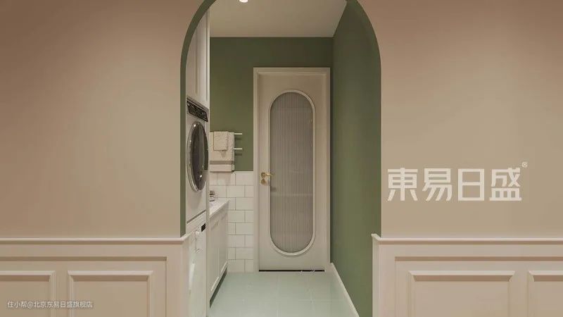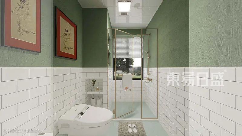 主卫采用干湿分区的设计,使浴室柜、洗衣机、烘干机与湿气较重的淋浴房分开。主卫使用白色小块墙砖半墙铺贴,上半部分刷牛油果绿的乳胶漆,地面铺贴淡绿色地砖,使色彩搭配不单调,富有层次感。