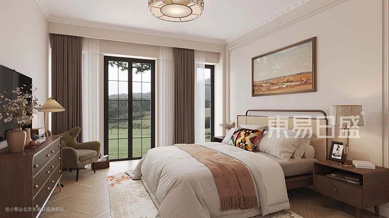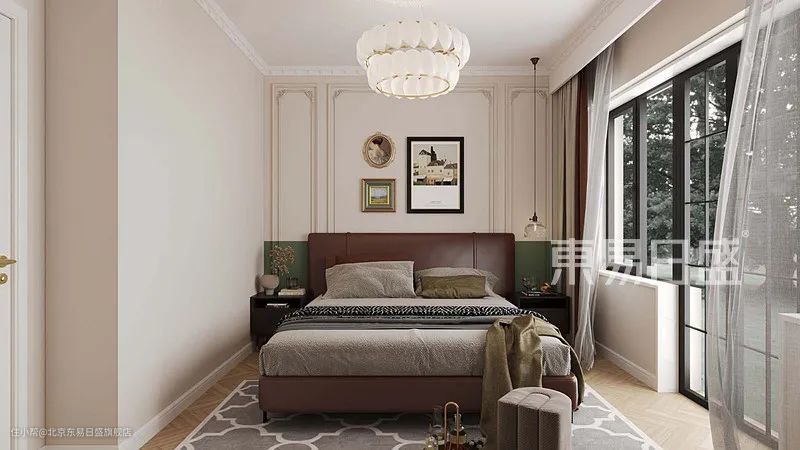 主卧作为主要休息区域,虽然是北向房间,但因为有大窗户,使得主卧空间依旧明亮,主卧室空间顶面造型简洁,线条流畅,顶面仍延续使用石膏装饰线,搭配主吊灯、床头吊灯。