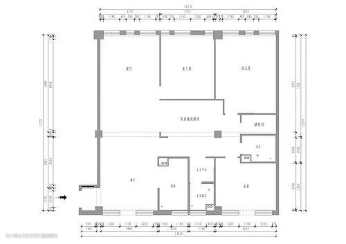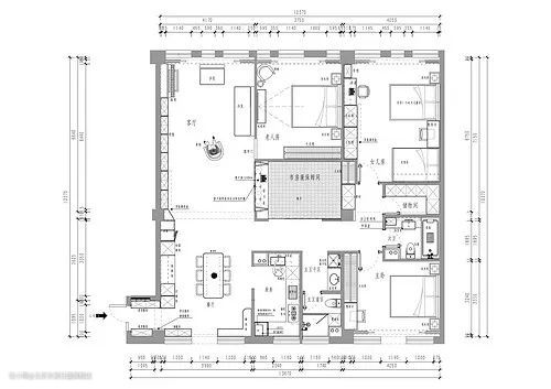 - 两个南向卧室做老人房和女儿房。老人房房门采用隐形门设计,不影响客厅空间的整体性。将女儿房一侧墙体整向内移动,压缩女儿房空间,做独立储物间,原主卫门改到过道方向。