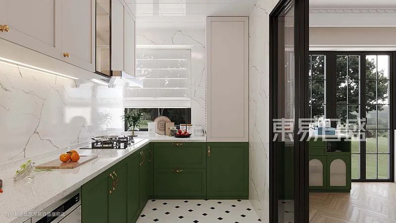 厨房空间采用U型橱柜的设计,充分利用厨房空间,扩大了操作区域及收纳空间;水槽与灶台分布由外至内,操作时更便捷;厨房空间利用墙面结构做吊柜,增加厨房收纳空间,同时将洗碗机嵌入地柜中,增加空间柜体的整体感,避免空间凌乱,便于厨房的收纳及整理。