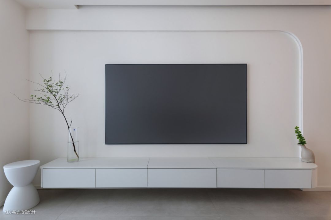 极简的悬浮式电视柜,线条感十分立体的墙面造型。虽说看起来很简单,但也在实用性的基础上,让视觉表现更加高级了。同时,少量的绿植增加,也为空间提供了更多的生机。