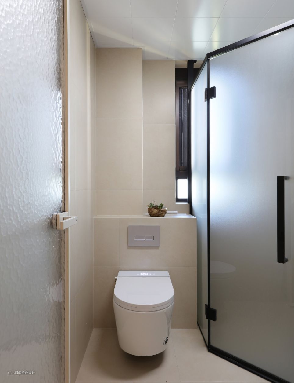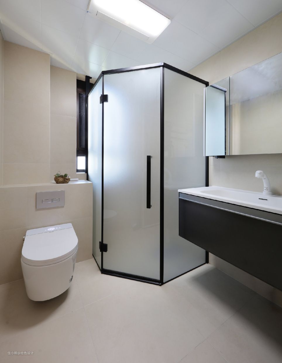 过道的尽头就是卫生间,墙地一体的瓷砖选择,悬空式洗漱台,以及独立的淋浴间设计,简洁又大方,并且还实现了收纳自由。